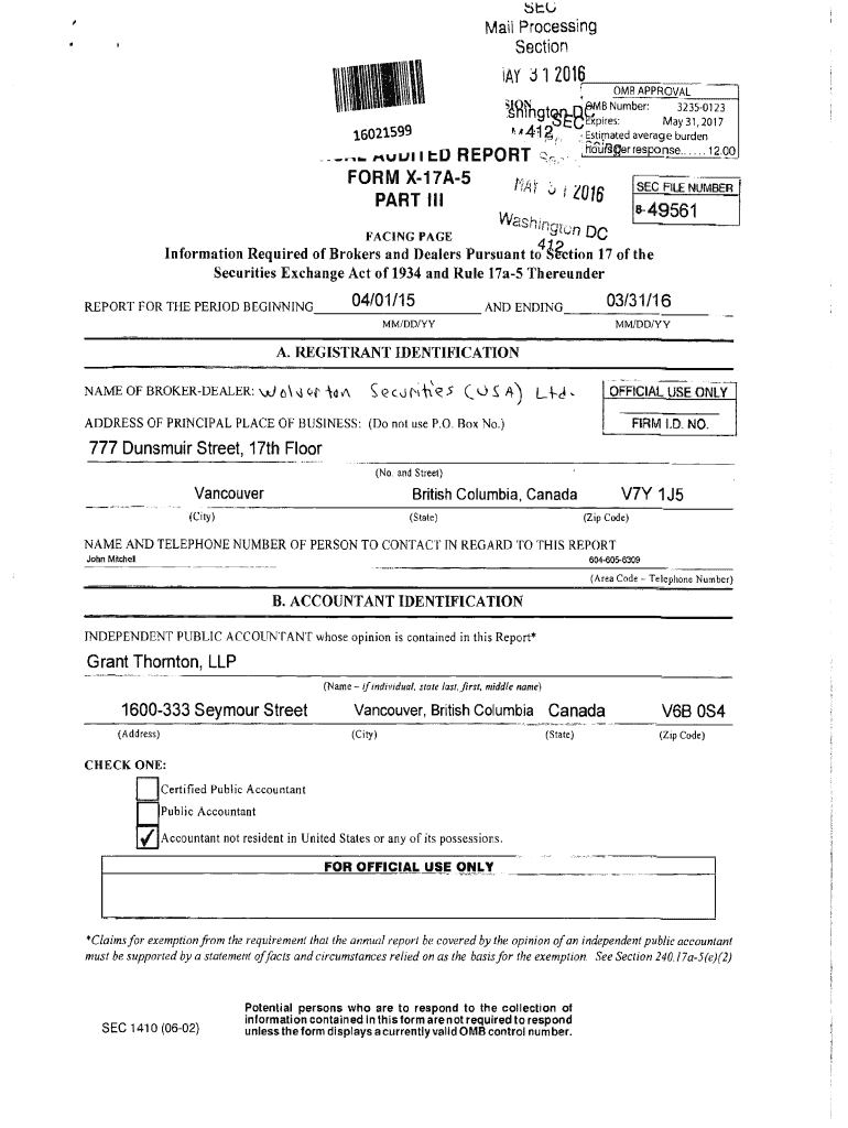 Studied Processing Sectional 31 2016 OMB APPROVAL 'state 'B Number: 32350123 4 l expires: May 31, 2017 16021599 r X41 Estimated average burden attire her response......12.00 Juul 1 TD REPORT r., Ra