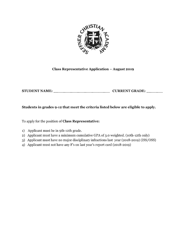 Class Representative Application August 2019STUDENT NAME: CURRENT GRADE: Students in grades 912 that meet the criteria listed below are eligible to apply. To apply for the position of Class Representative: