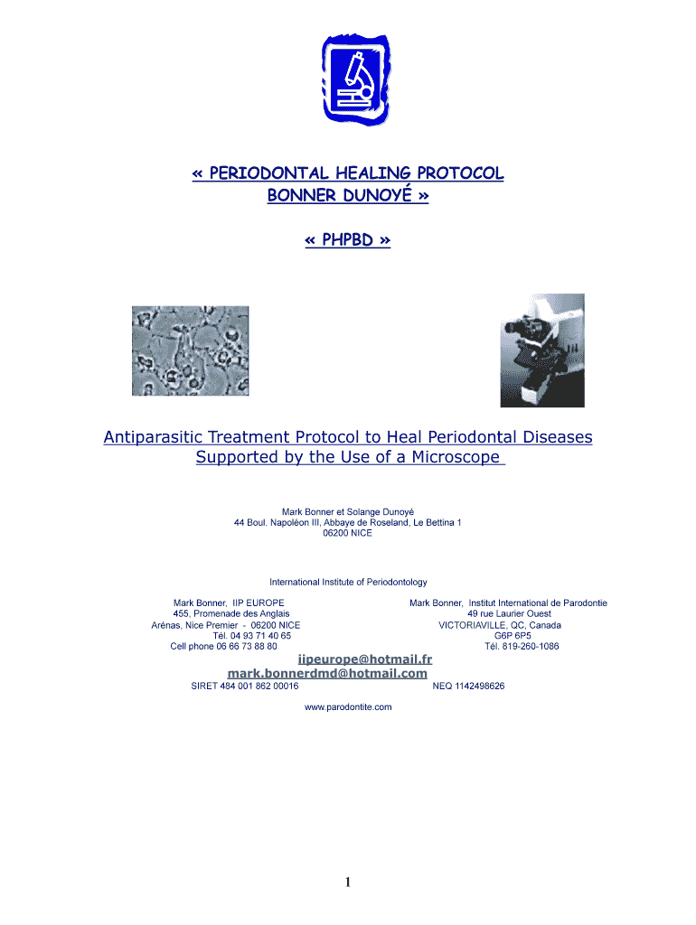 !PERIODONTAL HEALING PROTOCOL BONNER DUTY PHP BD Antiparasitic Treatment Protocol to Heal Periodontal Diseases Supported by the Use of a Microscope Mark Bonner et Orange Duty 44 Soul. Napoleon III,