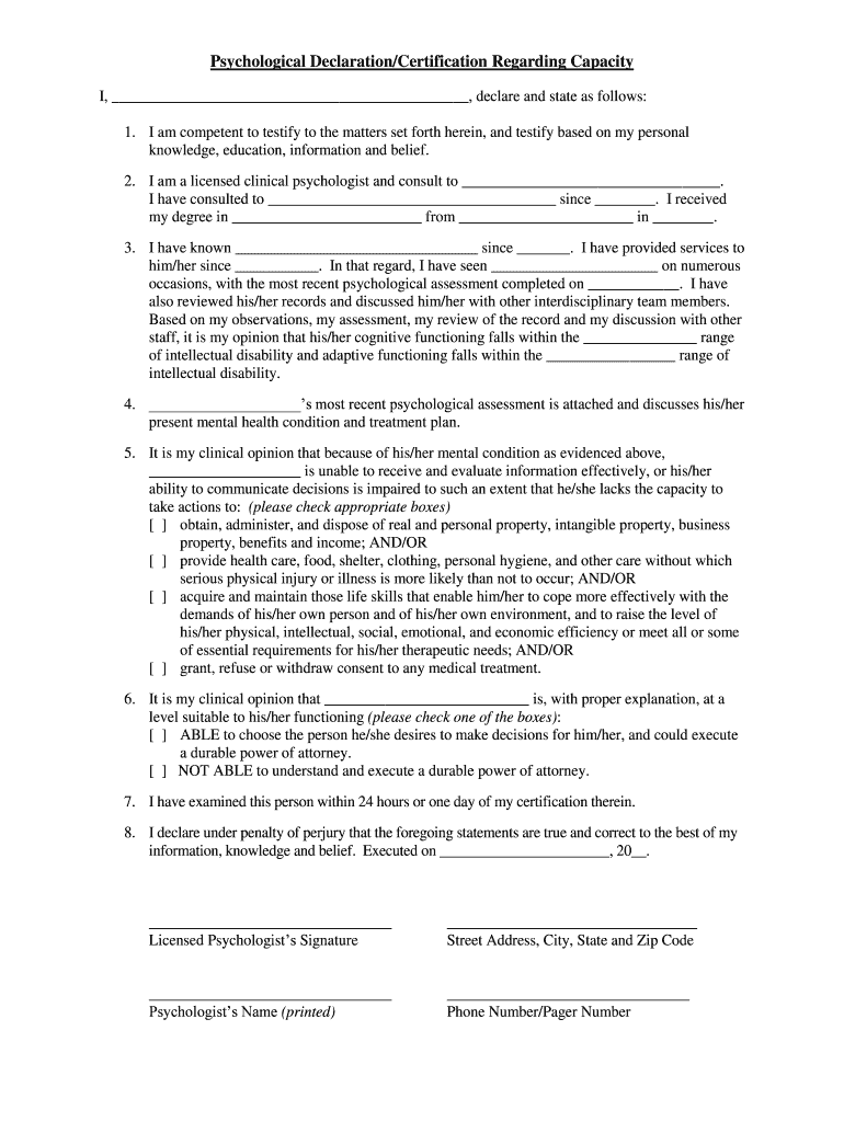 Psychological Declaration/Certification Regarding Capacity I, declare and state as follows: 1. I am competent to testify to the matters set forth herein, and testify based on my personal knowledge,