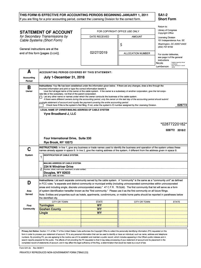 SA12 Short Forms FORM IS EFFECTIVE FOR ACCOUNTING PERIODS BEGINNING JANUARY 1, 2011, If you are filing for a prior accounting period, contact the Licensing Division for the correct form. Return to:STATEMENT