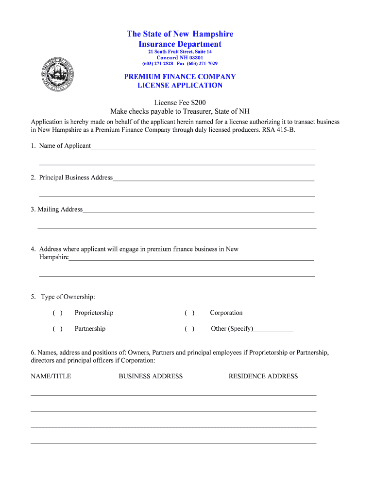 The State of New Hampshire Insurance Department 21 South Fruit Street, Suite 14 Concord NH 03301 (603) 2712528 Fax (603) 2717029PREMIUM FINANCE COMPANY LICENSE APPLICATION License Fee $200 Make checks
