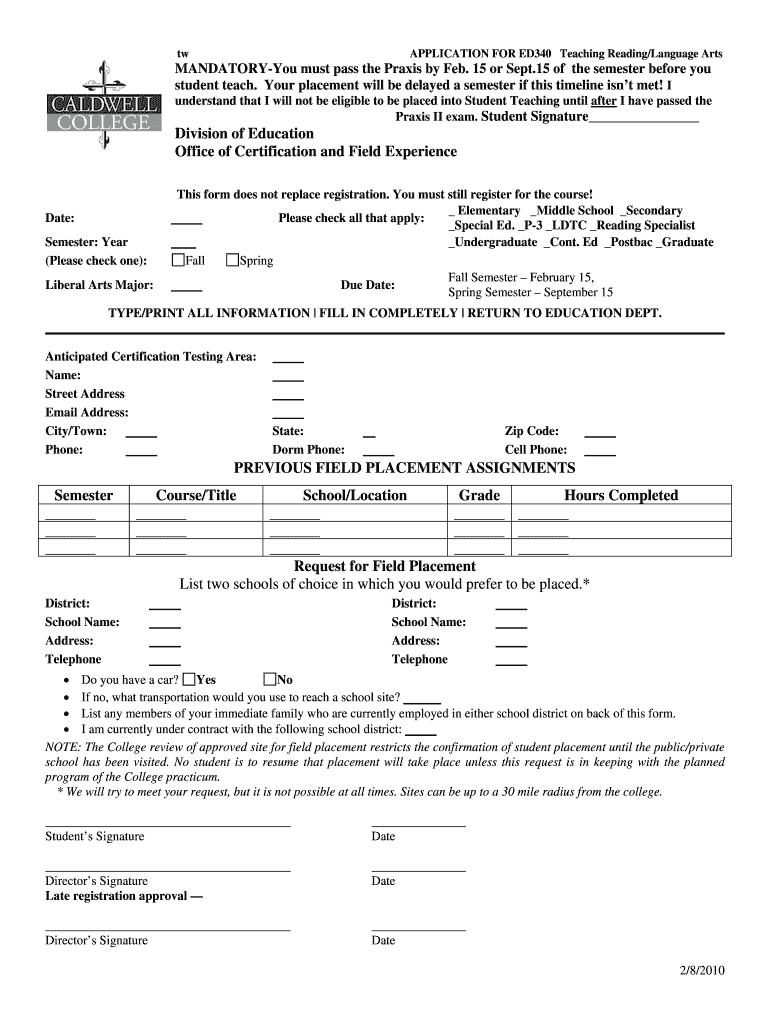 Application FOR ED340 Teaching Reading/Language ArtsMANDATORYYou must pass the Praxis by Feb. 15 or Sept.15 of the semester before you student teach. Your placement will be delayed a semester if this