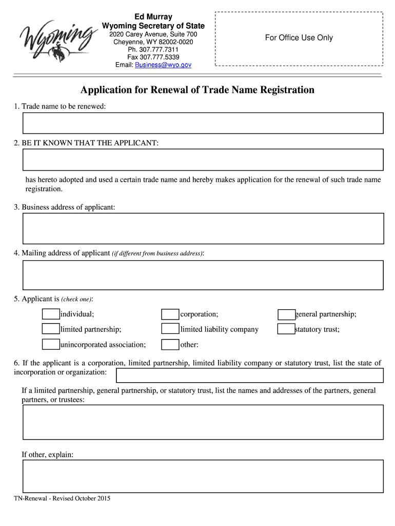 Get the free BRenewalb of Trade Name - Wyoming Secretary of State - soswy state wy