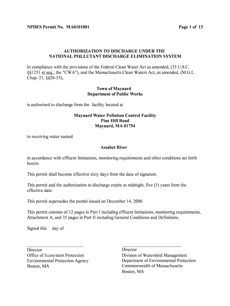NODES Permit No. MA0101001Page 1 of 13AUTHORIZATION TO DISCHARGE UNDER THE NATIONAL POLLUTANT DISCHARGE ELIMINATION SYSTEM In compliance with the provisions of the Federal Clean Water Act as amended,