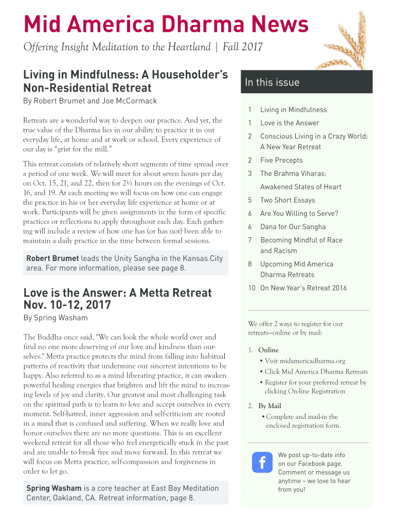 Mid-America Dharma News Offering Insight Meditation to the Heartland Fall 2017 Living in Mindfulness: A Householders Nonresidential Retreat By Robert Brunet and Joe McCormack Retreats are a wonderful