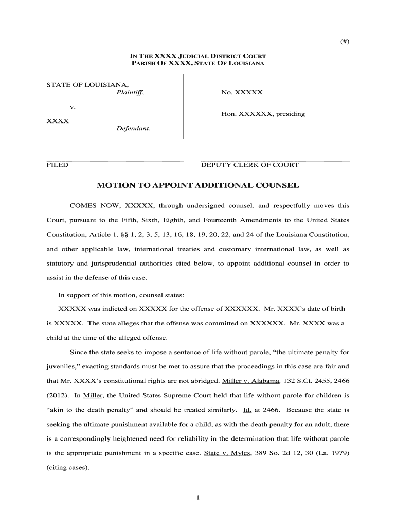 (#) IN THE XXX JUDICIAL DISTRICT COURT PARISH OF XXX, STATE OF LOUISIANASTATE OF LOUISIANA, Plaintiff, No. Xxxiv. Hon. XXX, presiding XXX Defendant.FILEDDEPUTY CLERK OF COMMOTION TO APPOINT ADDITIONAL