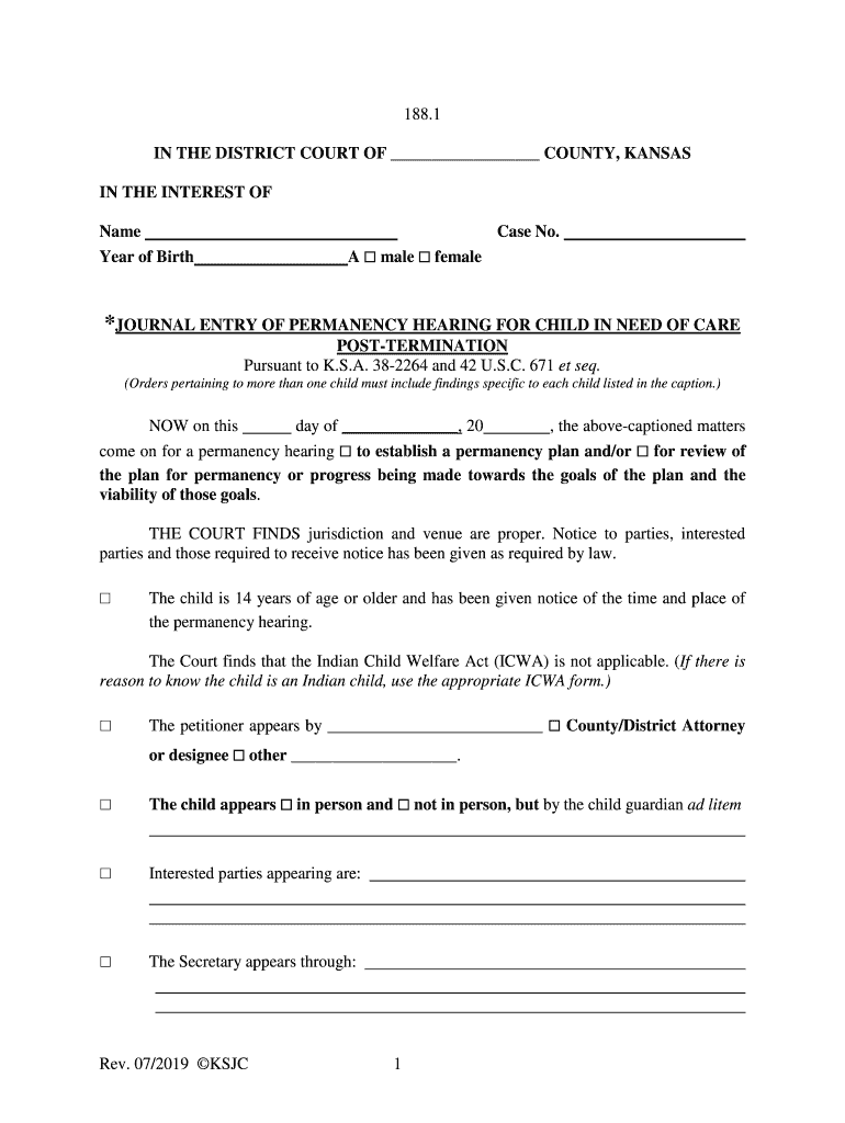 188.1 IN THE DISTRICT COURT OF COUNTY, KANSAS IN THE INTEREST OF Name Year of Birth Case No. A male female×JOURNAL ENTRY OF PERMANENCY HEARING FOR CHILD IN NEED OF CARE POSTERIZATION Pursuant to