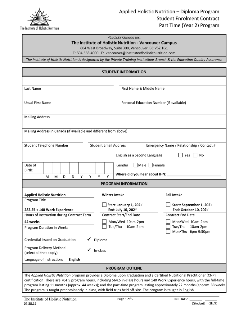 Applied Holistic Nutrition Diploma Program Student Enrollment Contract Part Time (Year 2) Program 7650329 Canada Inc. The Institute of Holistic Nutrition Vancouver Campus 604 West Broadway, Suite