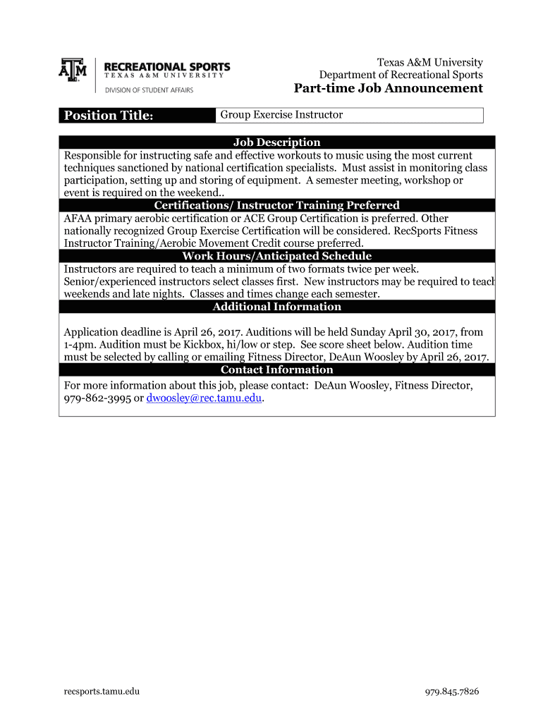 Texas A&M University Department of Recreational SportsParttime Job Announcement Position Title:Group Exercise Instructor Job Description Responsible for instructing safe and effective workouts to