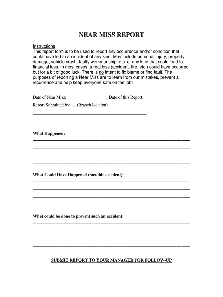 To fill out a near miss report, one should provide details about the incident including date, time, location, description of the incident, and any contributing factors.