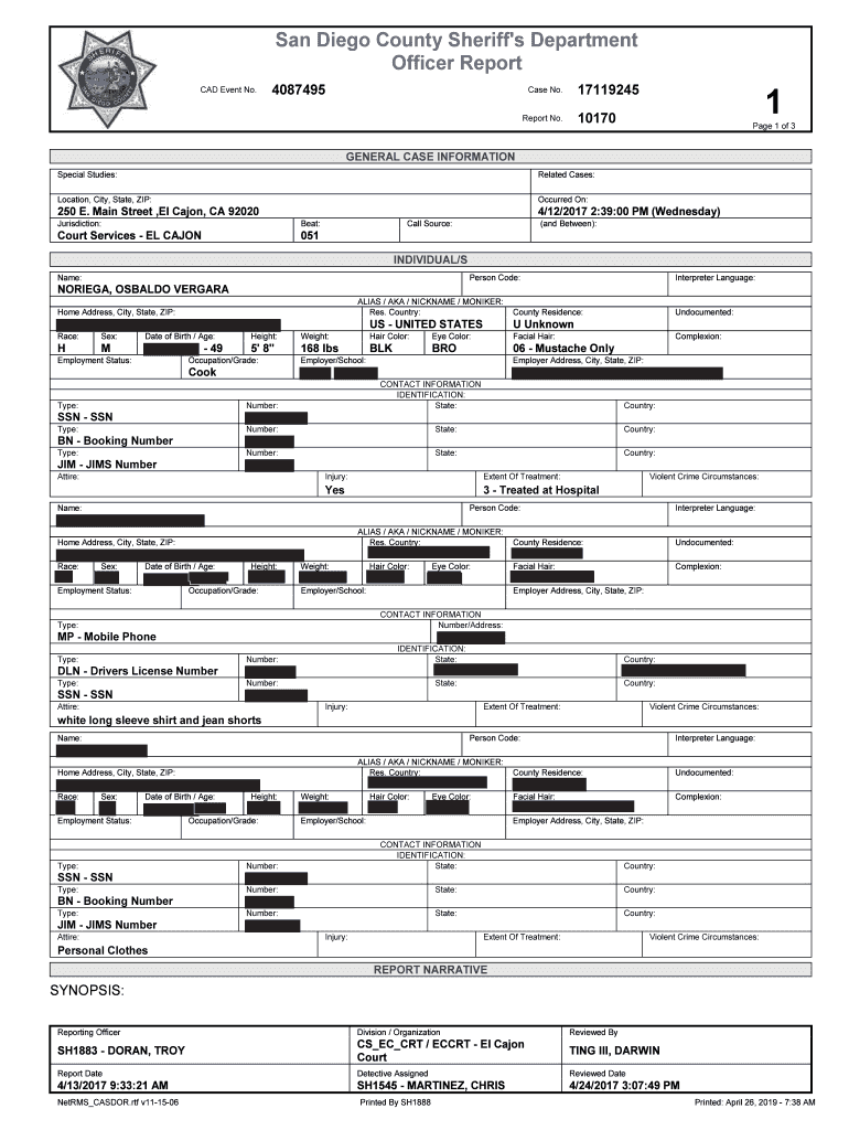 San Diego County Sheriff's Department Officer Report CAD Event No.408749517119245Case No.110170Report No. Page 1 of 3GENERAL CASE INFORMATION Special Studies:Related Cases:Location, City, State, ZIP:Occurred