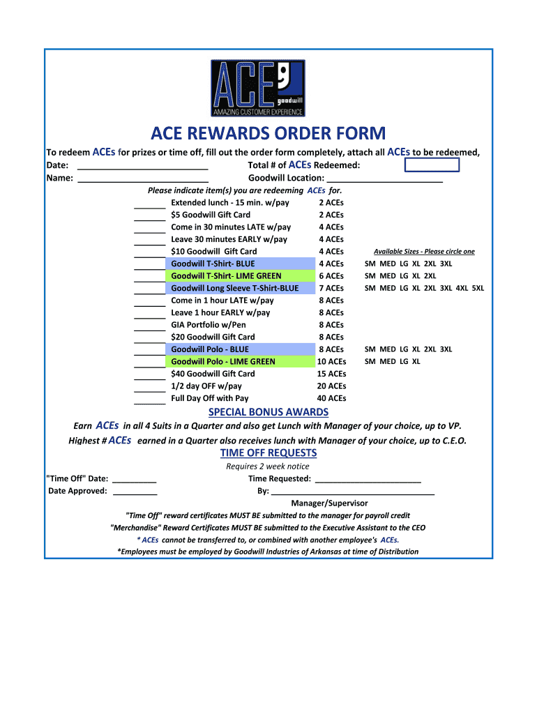 ACE REWARDS ORDER FORM To redeem ACE's for prizes or time off, fill out the order form completely, attach all ACE's to be redeemed, Date: Total # of ACE's Redeemed: Name: Goodwill Location: Please