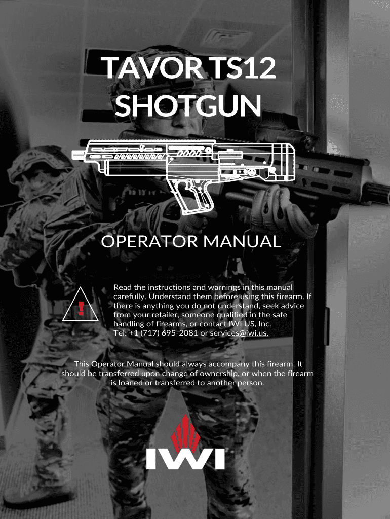 TAVOR TS12 SHOTGUN OPERATOR MANUAL Read the instructions and warnings in this manual carefully. Understand them before using this firearm. If there is anything you do not understand seek advice from your retailer someone qualified in the safe handling of firearms or contact IWI US Inc. Tel 1 717 695-2081 or services iwi. us. This Operator Manual should always accompany this firearm* It should be transferred upon change of ownership or when the firearm is loaned or transferred to another...