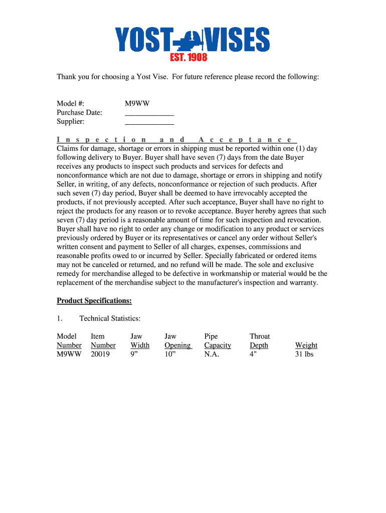 Thank you for choosing a Most Vise. For future reference please record the following:Model #: Purchase Date: Supplier:M9WW I n s p e c t i o n an n d A c c e p t an n c e Claims for damage, shortage