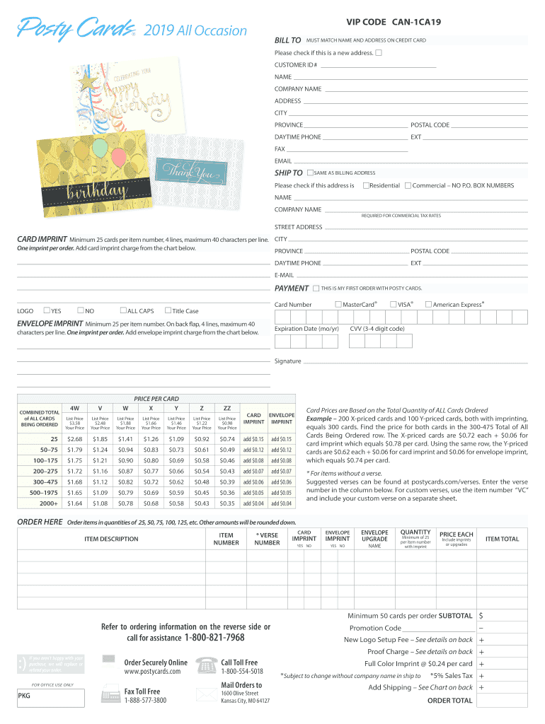 VIP CODE CAN1CA192019 All Occasionally MUST MATCH NAME AND ADDRESS ON CREDIT CARDPlease check if this is a new address. CUSTOMER ID# NAME COMPANY NAME ADDRESS CITYPROVINCEPOSTAL CODE DAYTIME PHONIEST