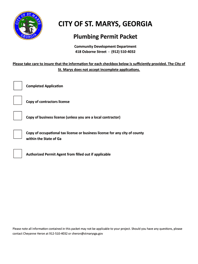 CITY OF ST. MARY, GEORGIA Plumbing Permit Packet Community Development Department 418 Osborne Street (912) 5104032 Please take care to ensure that the information for each checkbox below is sufficiently