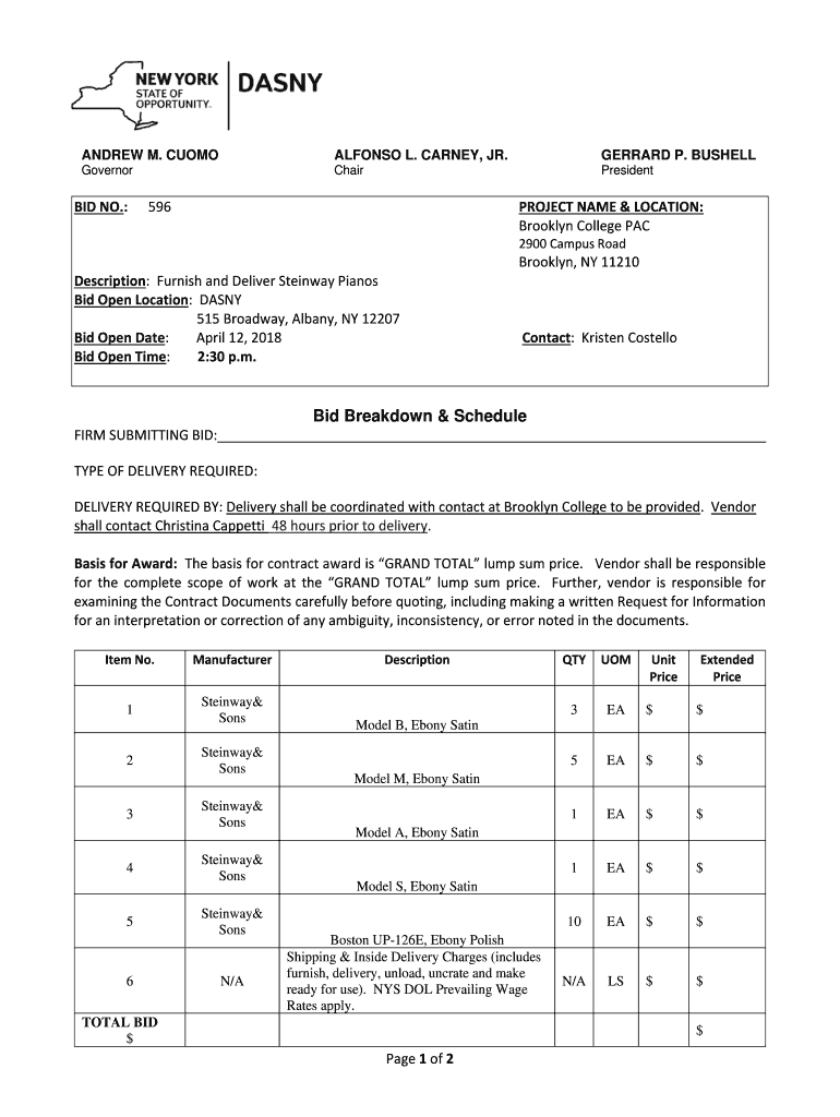 ANDREW M. CUOMOALFONSO L. CARNEY, JR.GERRARD P. BUSHELLGovernorChairPresidentBID NO.:PROJECT NAME & LOCATION: Brooklyn College PAC5962900 Campus RoadDescription: Furnish and Deliver Steinway Pianos