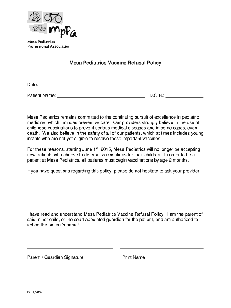 Mesa Pediatrics Vaccine Refusal Policymaker: Patient Name: D.O.B.: Mesa Pediatrics remains committed to the continuing pursuit of excellence in pediatric medicine, which includes preventive care.