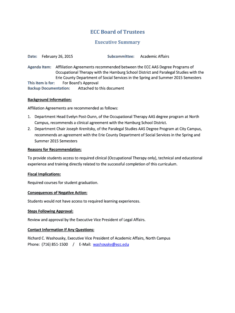 ECC Board of Trustees Executive Summary Date:February 26, 2015Subcommittee:Academic AffairsAgenda Item:Affiliation Agreements recommended between the ECC AAS Degree Programs of Occupational Therapy