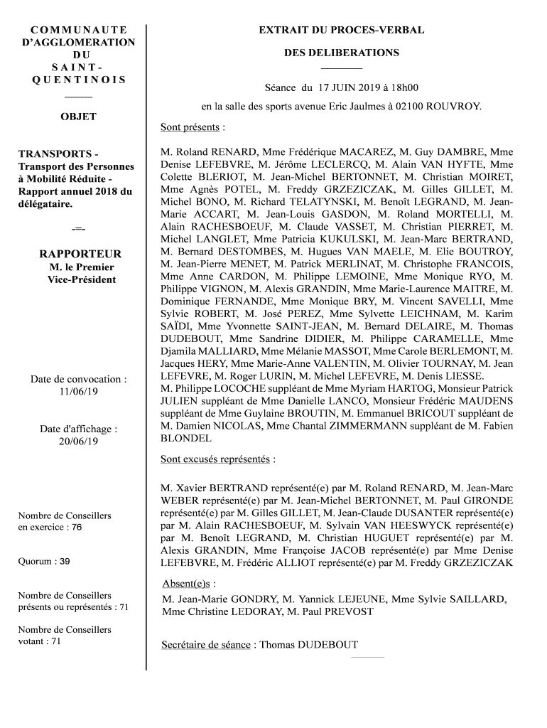 COMMINUTE AGGLOMERATION DU SAINTQUENTINOIS OBJECT TRANSPORTS Transport DES Personnel Mobility Route Rapport annual 2018 Du flatware. RAPPORTEUR M. LE Premier VicePrsidentDate de convocation : 11/06/19
