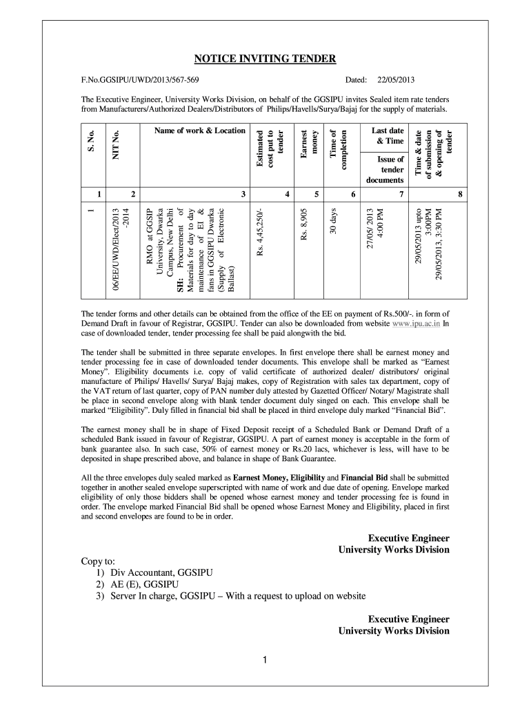 NOTICE INVITING TENDER F. No.GGSIPU/UWD/2013/567569Dated:22/05/20136Time & date of submission & opening of tenderize of tender documents27/05/ 2013 4:00 PM78 29/05/2013 unto 3:00PM 29/05/2013, 3:30
