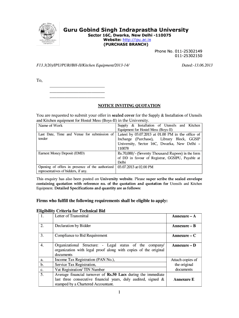 Guru Go bind Singh Indraprastha University Sector 16C, Dark, New Delhi 110075 Website: http://ipu.ac.in (PURCHASE BRANCH) Phone No. 01125302149 01125302150F13.3(20)/CPU/PUR//BAII/Kitchen Equipment/201314/Dated:13.06.2013To,