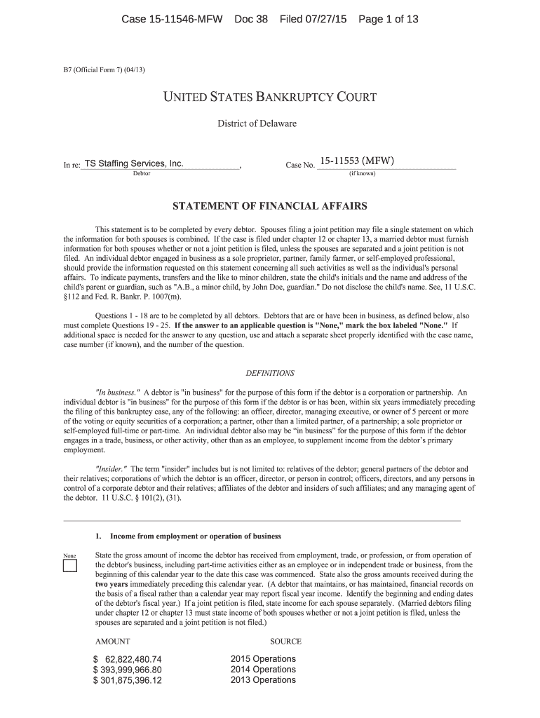 Case 1511546MFWDoc 38Filed 07/27/15Page 1 of 13B7 (Official Form 7) (04/13)UNITED STATES BANKRUPTCY COURT of District Delaware1511553 (MFA) Case No. TS Staffing Services, Inc. In re:, Debtor(if known)STATEMENT
