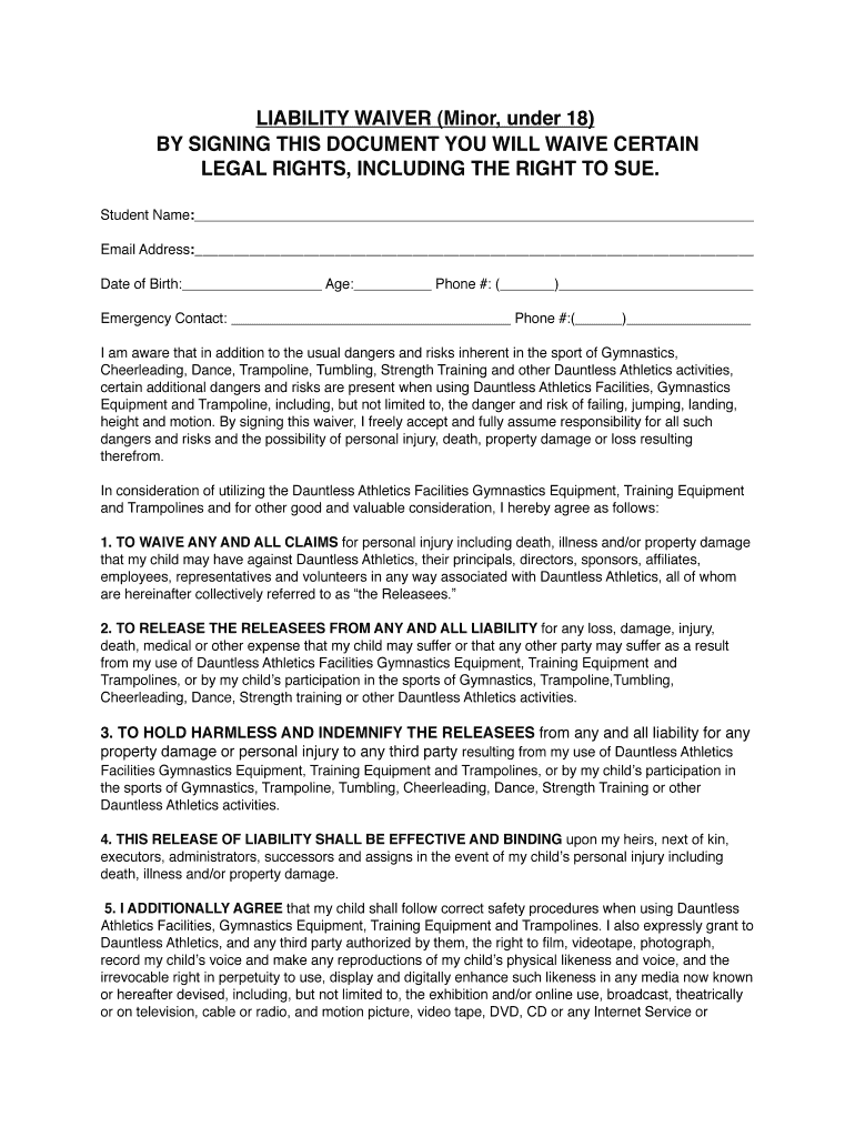 The Liability Waiver for Minors is a legal document used by parents or guardians to waive certain legal rights for minors participating in activities like gymnastics, cheerleading, and trampoline at Dauntless Athletics in Arizona.