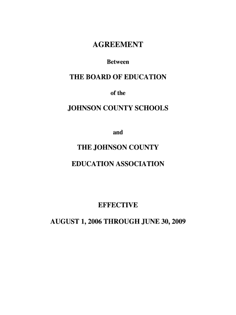 AGREEMENT Between THE BOARD OF EDUCATION of the JOHNSON COUNTY SCHOOLS and THE JOHNSON COUNTY EDUCATION ASSOCIATION EFFECTIVE AUGUST 1, 2006, THROUGH JUNE 30, 2009, ARTICLE I: PREAMBLE This Agreement