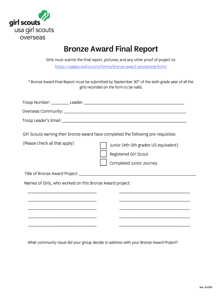 Bronze Award Final Report Girls must submit the final report, pictures, and any other proof of project to: https://usagso.wufoo.com/forms/bronzeawardprocessingform/* Bronze Award Final Report must