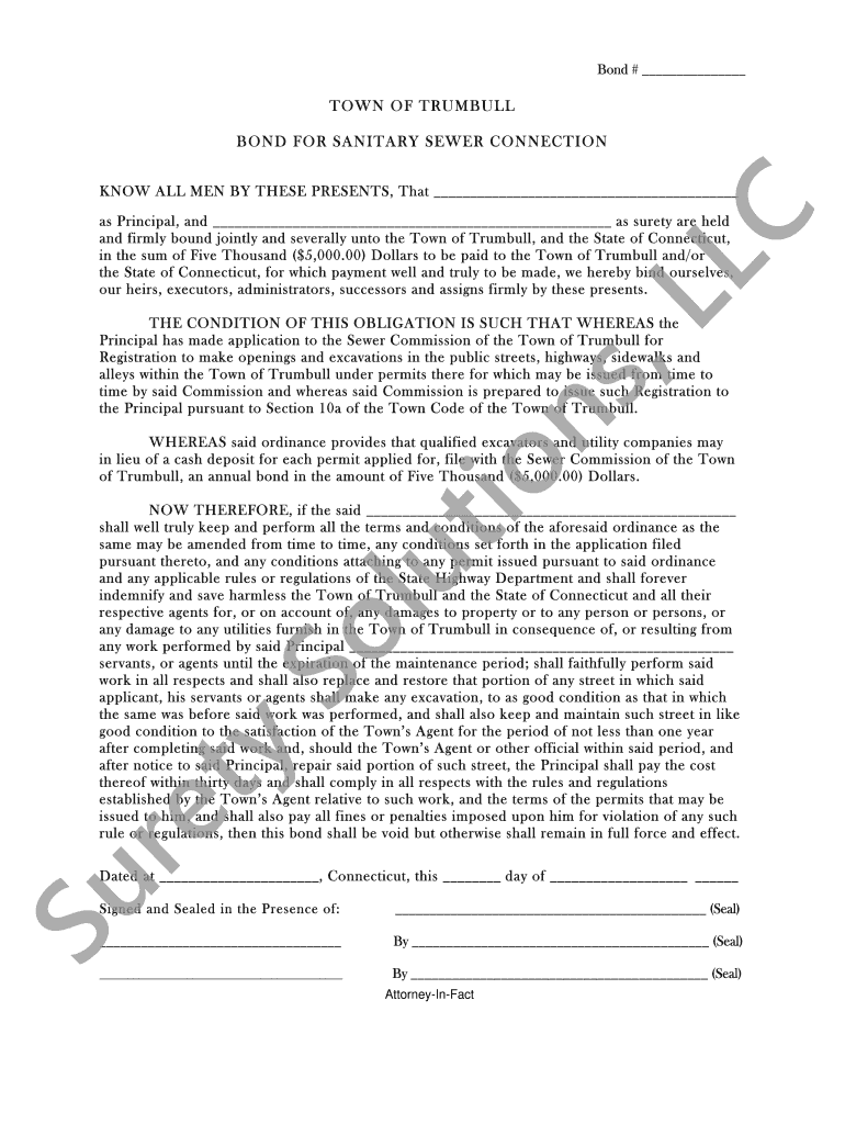 Bond # TOWN OF TRUMBULL BOND FOR SANITARY SEWER CONNECTION, L LUCKNOW ALL MEN BY THESE PRESENTS, That as Principal, and as surety are held and firmly bound jointly and severally unto the Town of Trumbull,