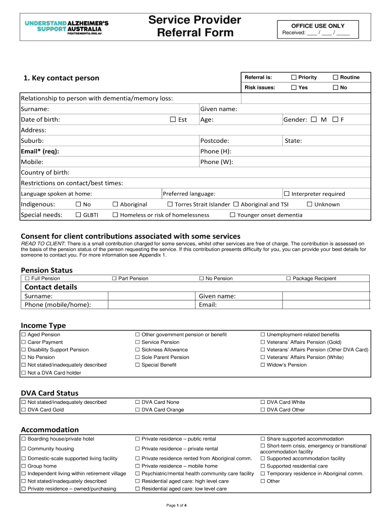 Service Provider Referral Form1. Key contact personOFFICE USE ONLY Received: / / Referral is:PriorityRoutineRisk issues:YesNoRelationship to person with dementia/memory loss: Surname:Given name:Date
