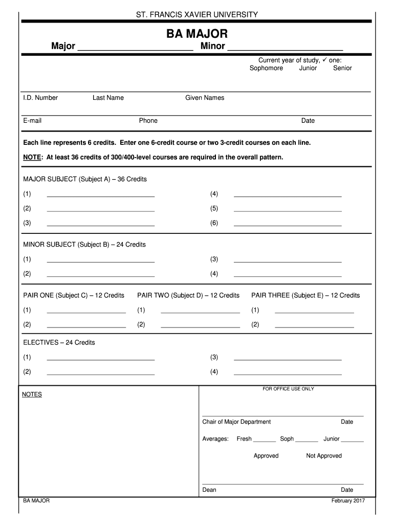 ST. FRANCIS XAVIER UNIVERSITY BA MAJOR Minor Current year of study, one: Sophomore Junior Senior. D. Numberless NameEmailGiven NamesPhoneDateEach line represents 6 credits. Enter one 6credit course