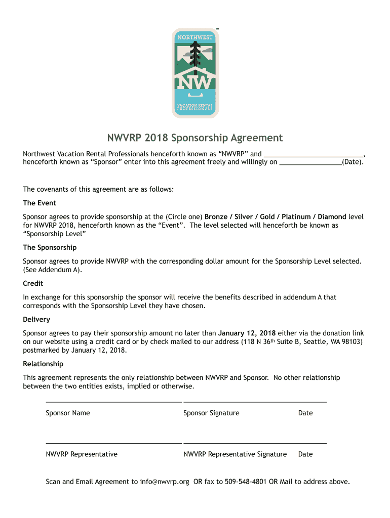 NW VRP 2018 Sponsorship Agreement Northwest Vacation Rental Professionals henceforth known as NW VRP and, henceforth known as Sponsor enter into this agreement freely and willingly on (Date). The