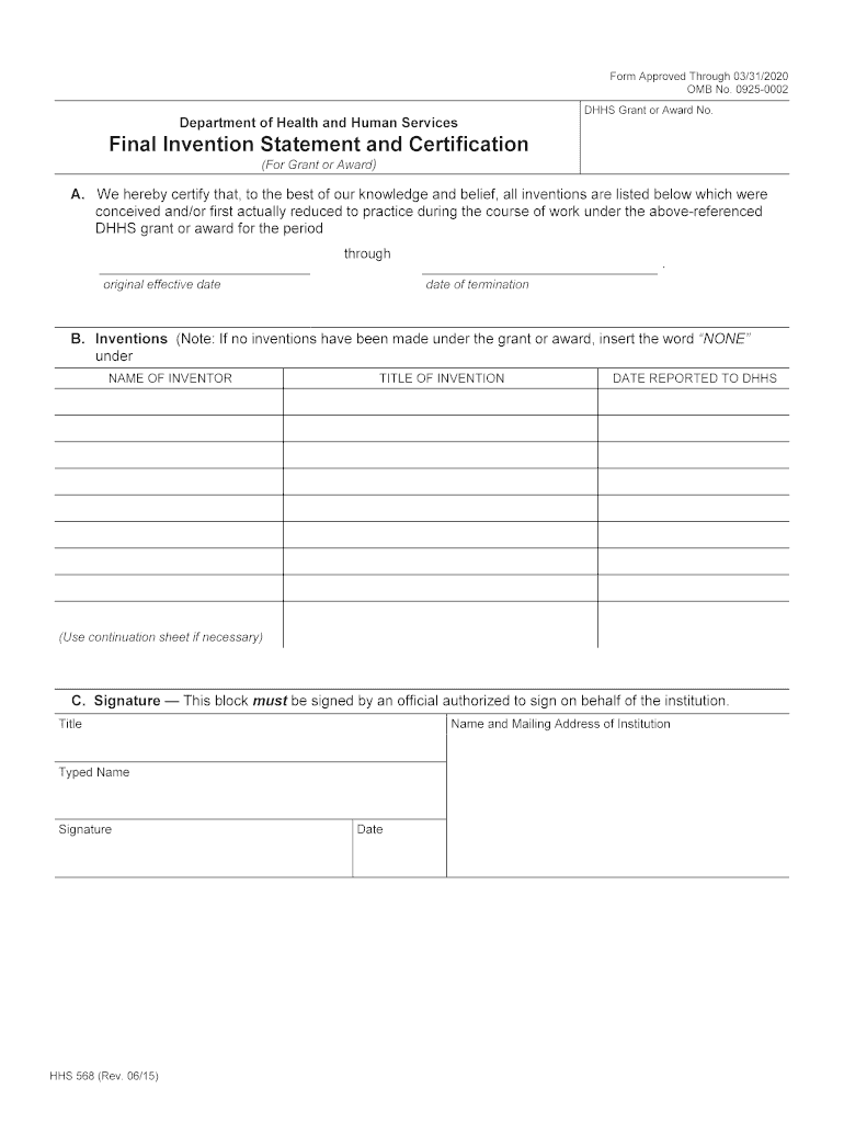Get the free Final Invention Statement, Form HHS 568 (Rev. 06/15)