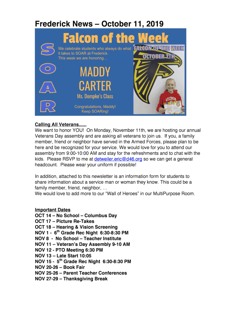 Frederick News October 11, 2019Calling All Veterans...... We want to honor YOU! On Monday, November 11th, we are hosting our annual Veterans Day assembly and are asking all veterans to join us. If