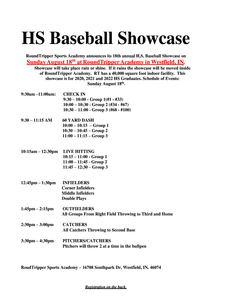 HS Baseball Showcase RoundTripper Sports Academy announces its 18th annual H.S. Baseball Showcase on Sunday, August 18th at RoundTripper Academy in Westfield, IN. Showcase will take place rain or