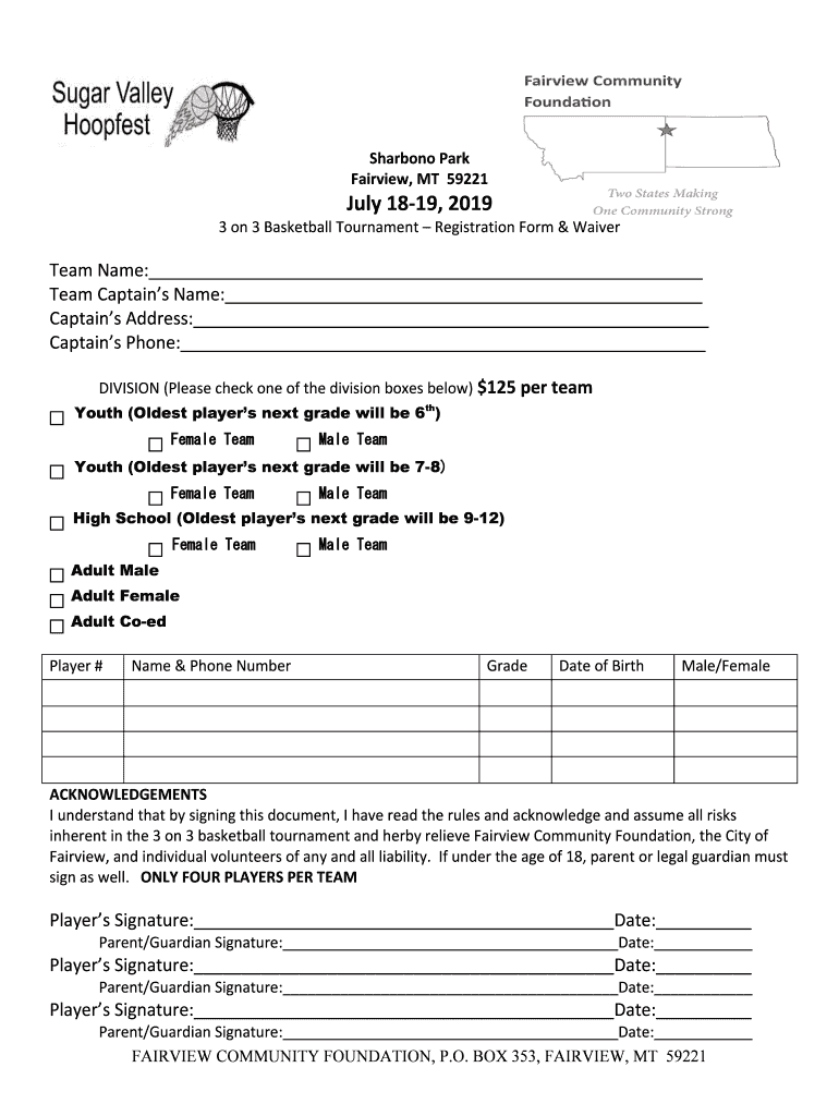 Sharon Park Fairview, MT 59221July 1819, 20193 on 3 Basketball Tournament Registration Form & WaiverTeam Name: Team Captains Name: Captains Address: Captains Phone: DIVISION (Please check one of the