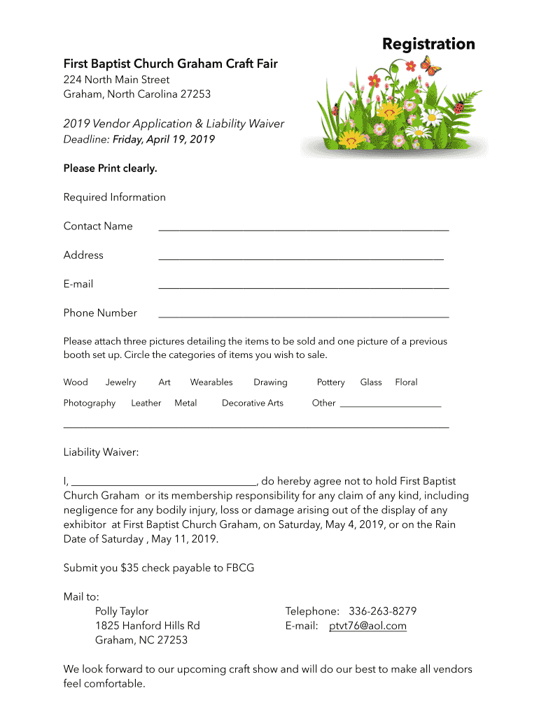 Registration First Baptist Church Graham Craft Fair 224 North Main Street Graham, North Carolina 272532019 Vendor Application & Liability Waiver Deadline: Friday, April 19, 2019, Please Print clearly.