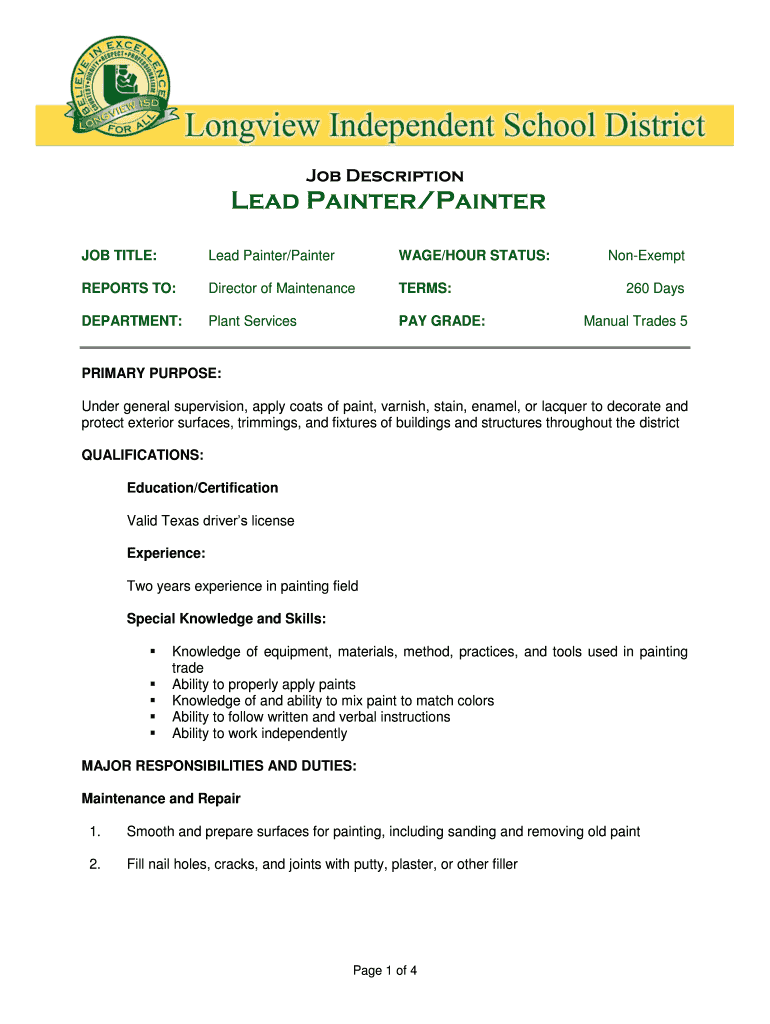 Get the free Painter Job Description Sample : HR ResourcesRecruitment ... - w3 lisd