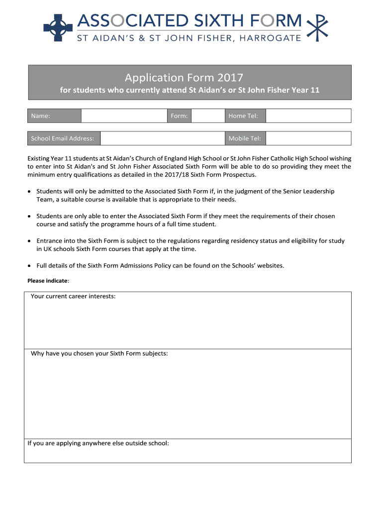 Application Form 2017 for students who currently attend St Aidan or St John Fisher Year 11 Name: School Email Address:Form:Home Tel: Mobile Tel:Existing Year 11 students at St Aidan Church of England