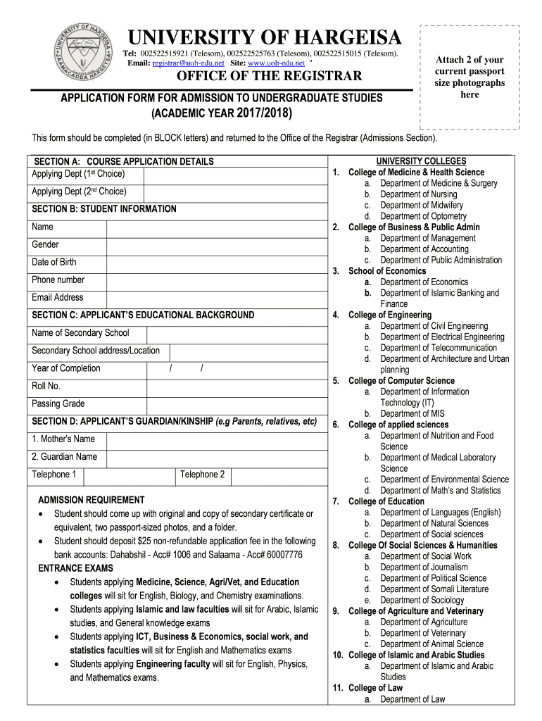 UNIVERSITY OF LARGEST Tel: 002522515921 (Telecom), 002522525763 (Telecom), 002522515015 (Telecom). Email: registrar oohed.net Site: www.uohedu.net “OFFICE OF THE REGISTRAR APPLICATION FORM FOR ADMISSION