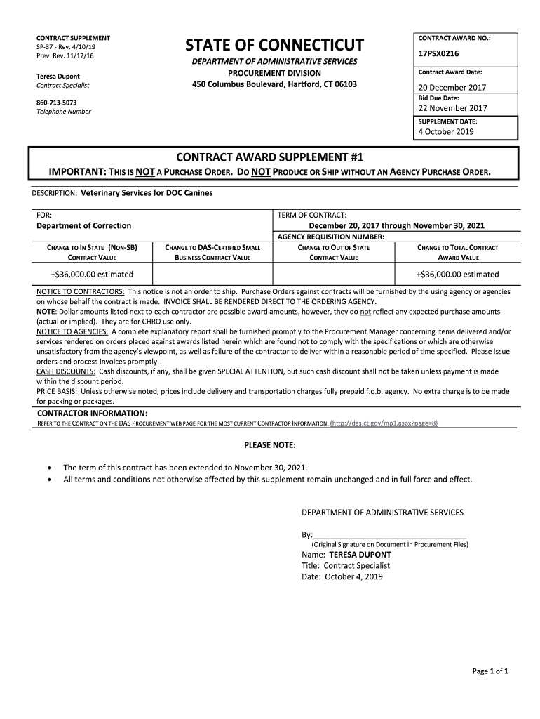 CONTRACT SUPPLEMENT SP37 Rev. 4/10/19 Prey. Rev. 11/17/16 Teresa Dupont Contract SpecialistSTATE OF CONNECTICUT DEPARTMENT OF ADMINISTRATIVE SERVICES PROCUREMENT DIVISION 450 Columbus Boulevard, Hartford,