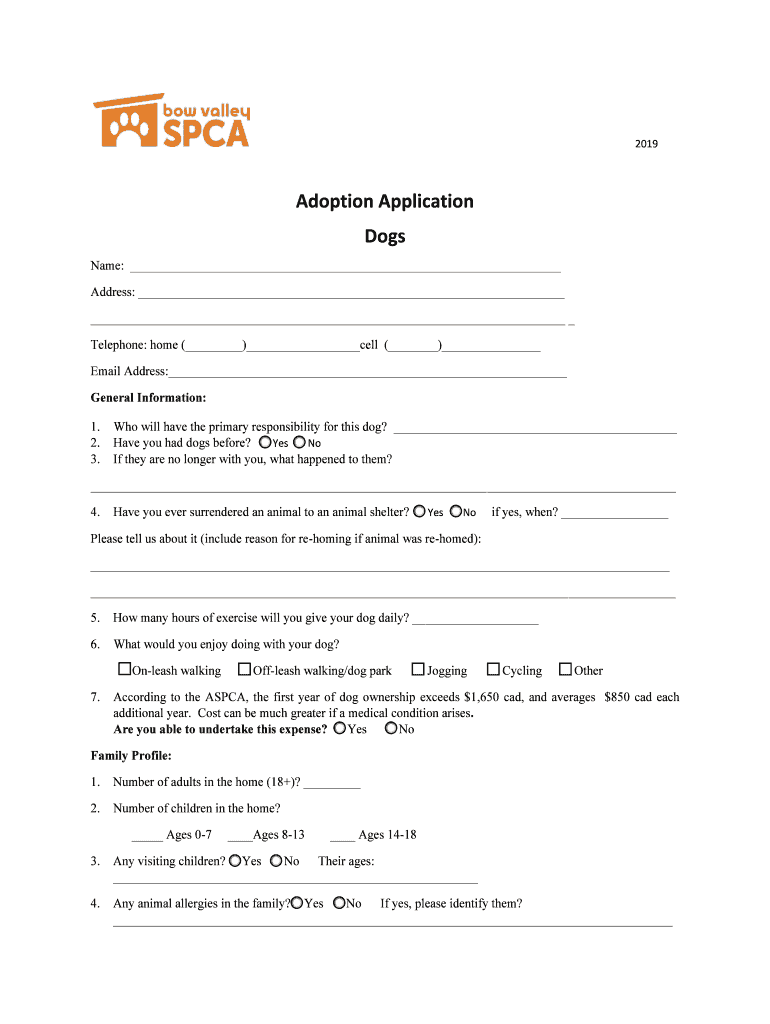 2019Adoption Application Dogs Name: Address: Telephone: home () cell () Email Address: General Information: 1. 2. 3. Who will have the primary responsibility for this dog? Have you had dogs before?