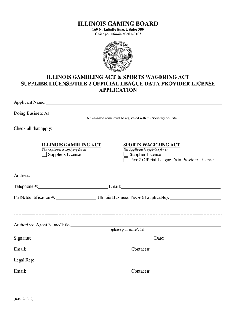 ILLINOIS GAMING BOARD 160 N. Basally Street, Suite 300 Chicago, Illinois 606013103ILLINOIS GAMBLING ACT & SPORTS WAGERING ACT SUPPLIER LICENSE/TIER 2 OFFICIAL LEAGUE DATA PROVIDER LICENSE APPLICATION