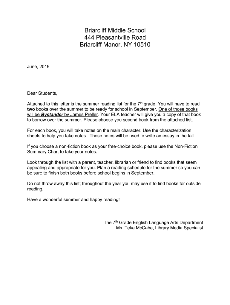 Attached to this letter is the summer reading list for the 7th grade. You will have to read
