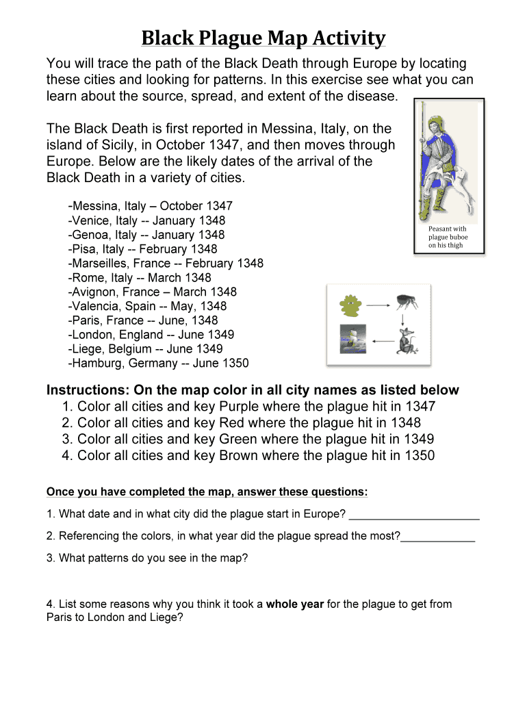 BlackPlagueMapActivity You will trace the path of the Black Death through Europe by locating these cities and looking for patterns. In this exercise see what you can learn about the source, spread,