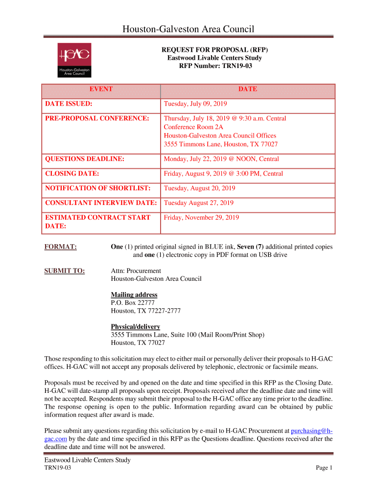 Houston Galveston Area Council REQUEST FOR PROPOSAL (RFP) Eastwood Livable Centers Study RFP Number: TRN1903 EVENTDATEDATE ISSUED:Tuesday, July 09, 2019PREPROPOSAL CONFERENCE:Thursday, July 18, 2019