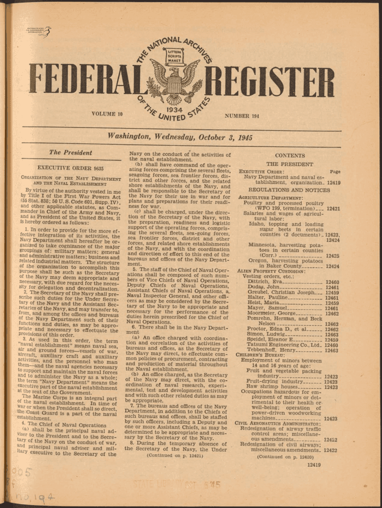 FEDERAL VOLUME 10REGISTER 1934NUMBER 194 A IT E D, Washington Wednesday, October 3, 1945, The President Navy on the conduct of the activities of the naval establishment. (b) shall have command of